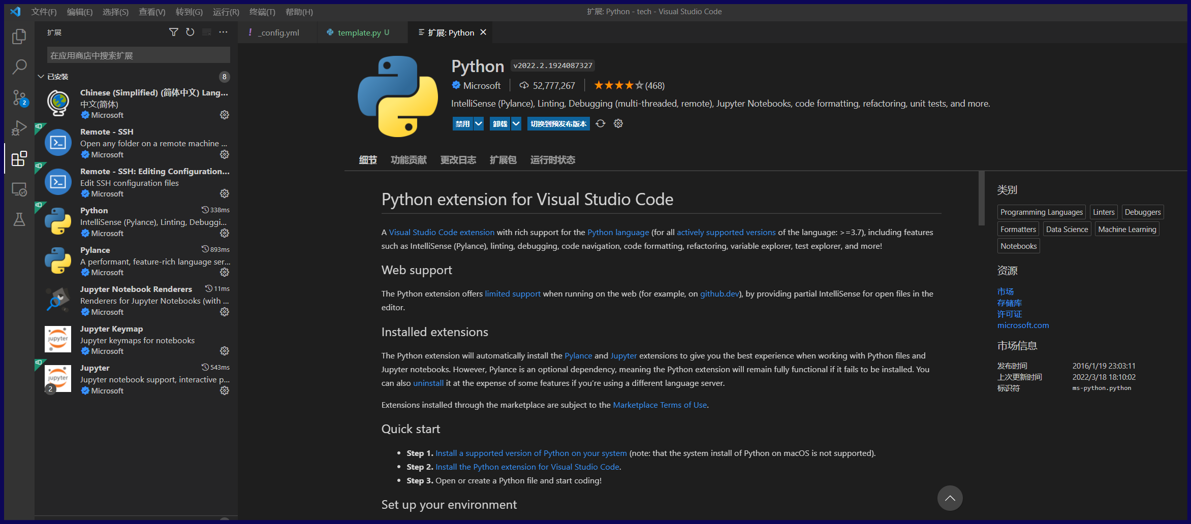 如下图,在VScode中搜索python插件,并点击安装即可。下图为安装成功的状态。