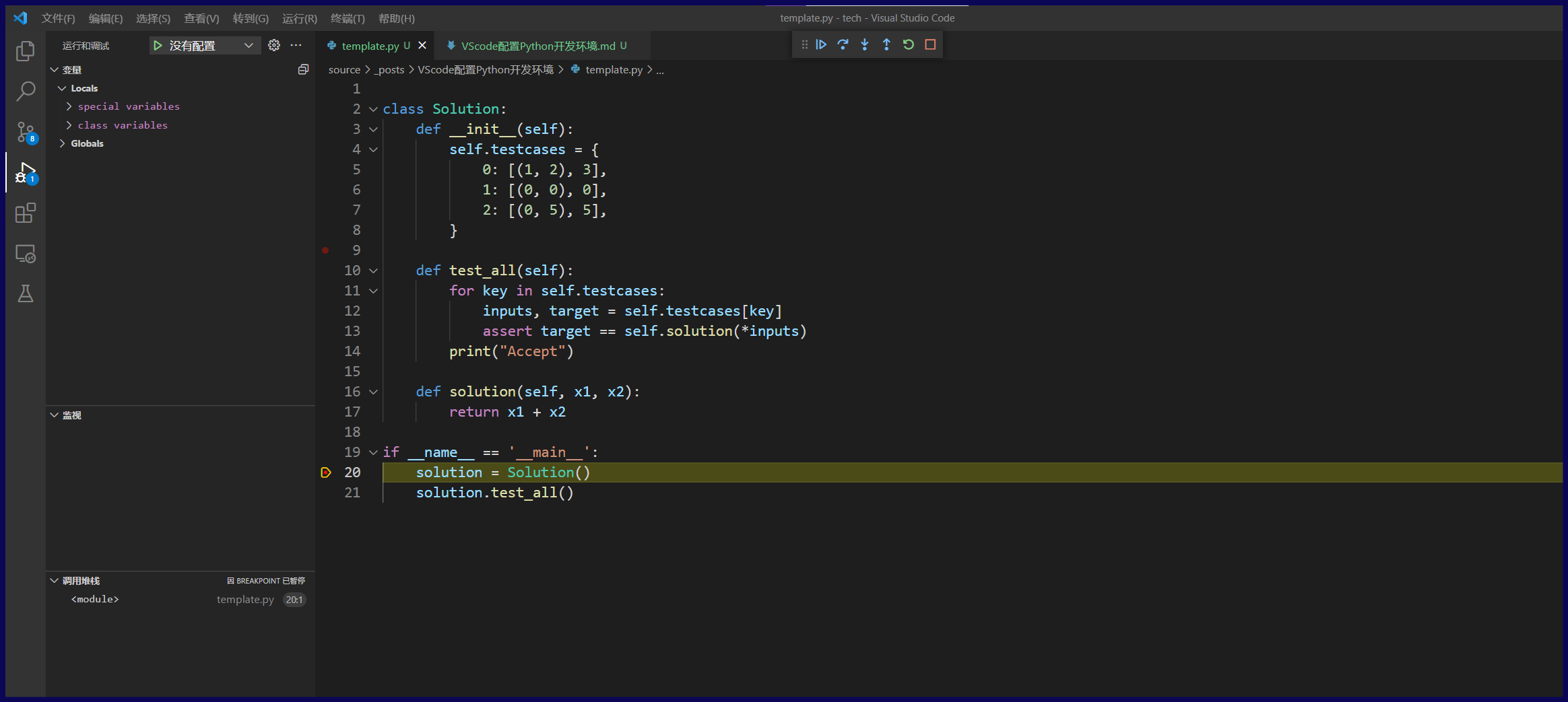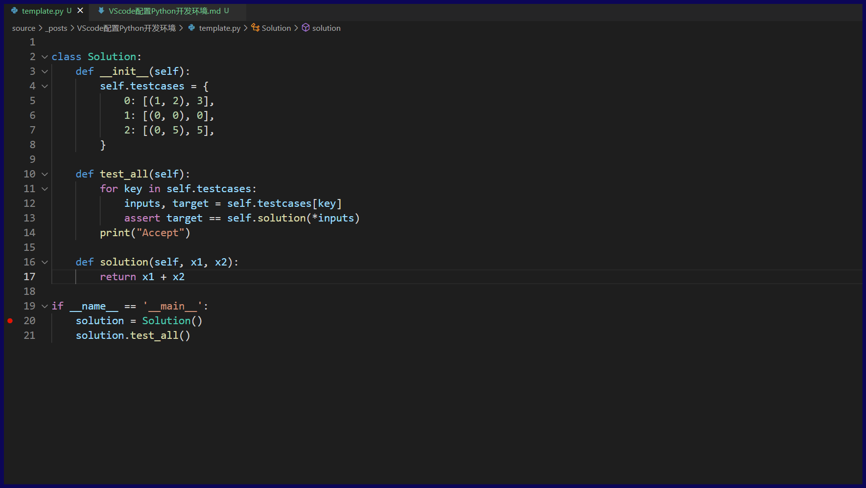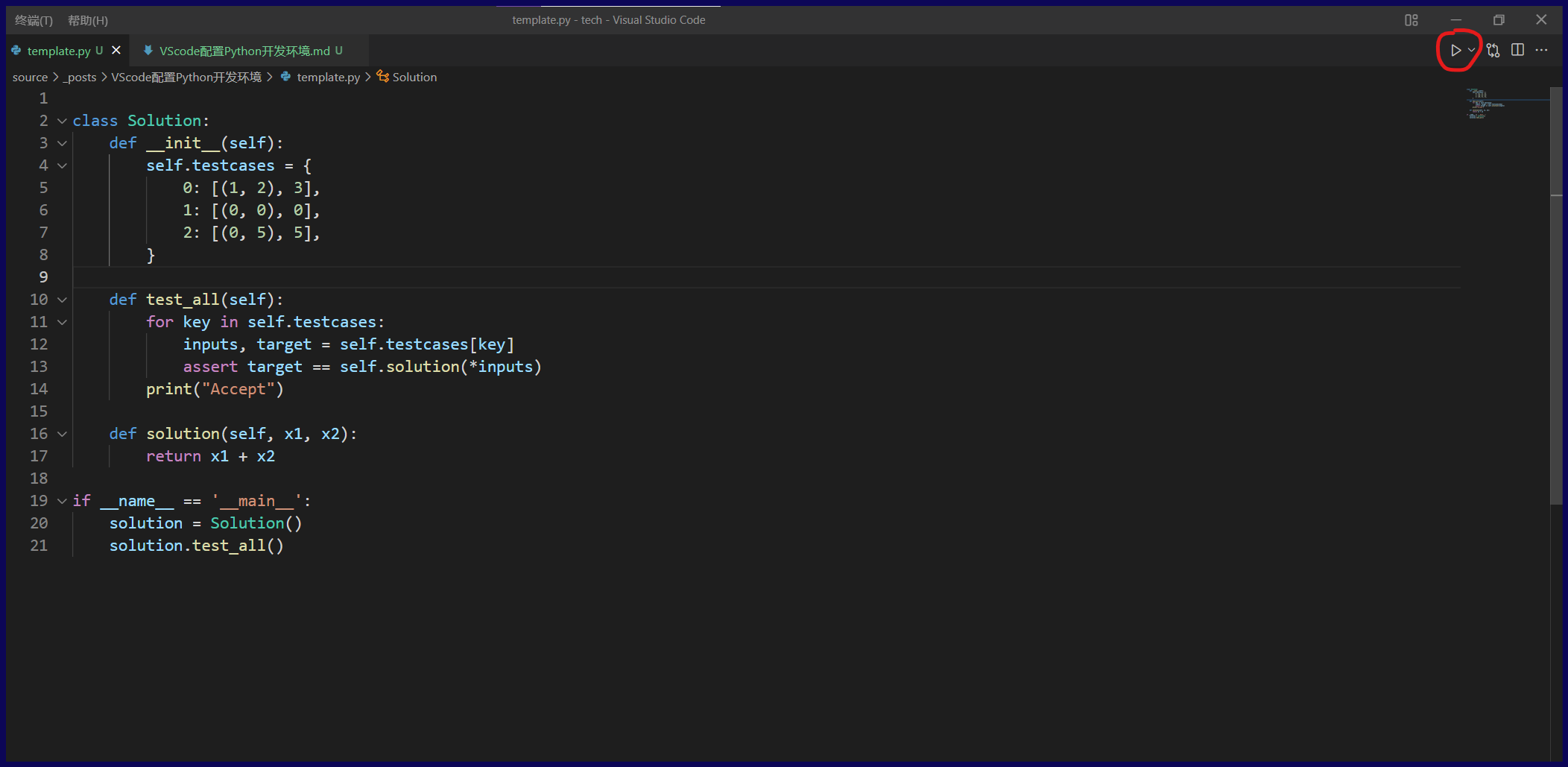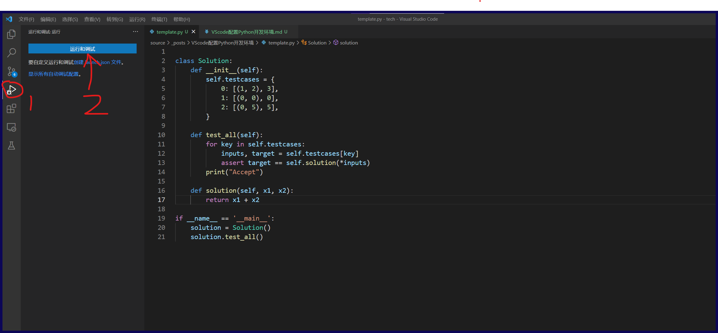 首先在VScode中新建一个Python文件(需要注意文件后缀名为.py),并完成编码。笔者提供一个模板,见template.py。